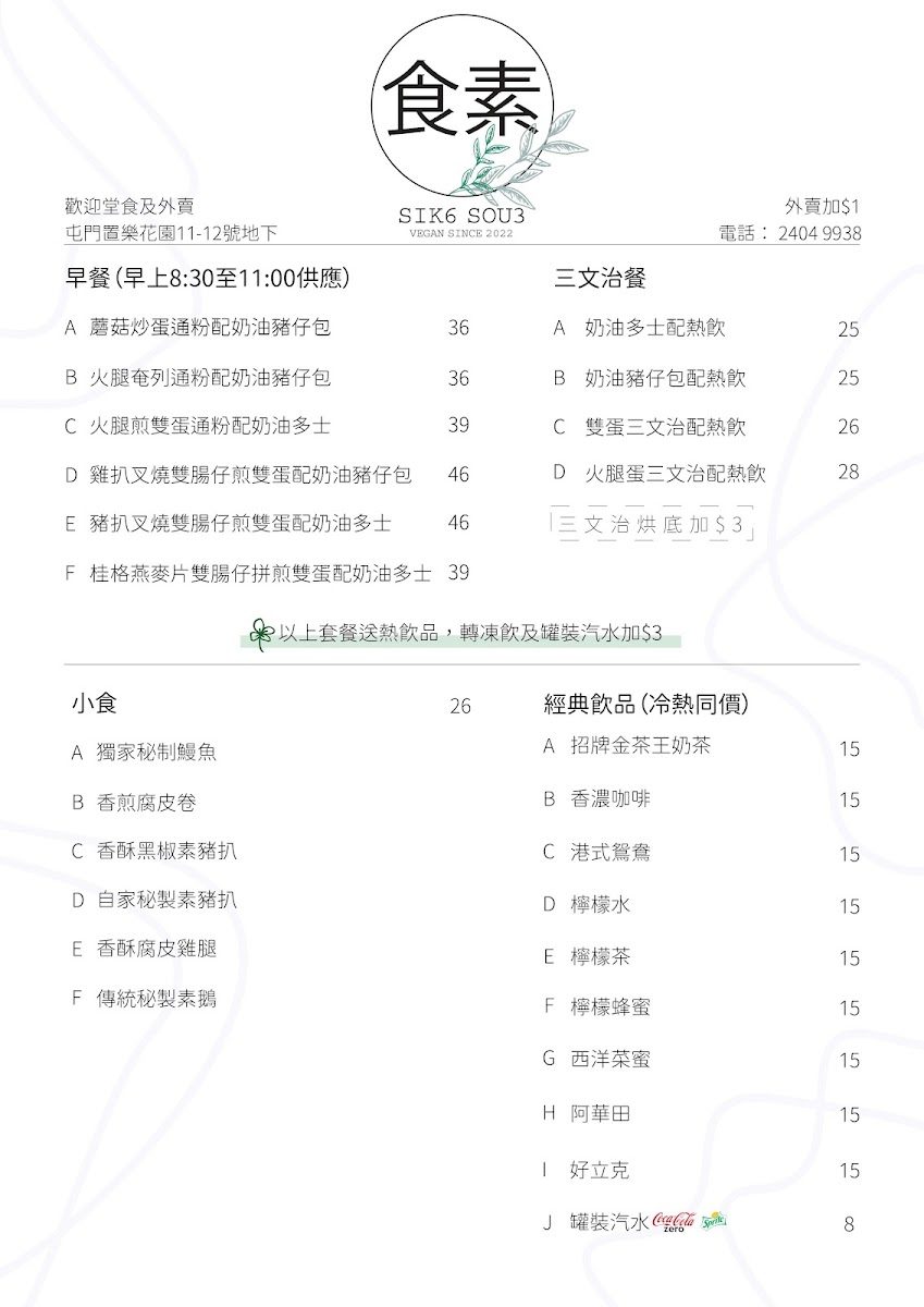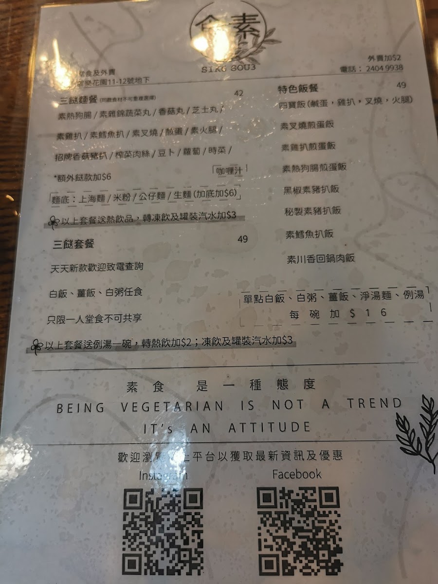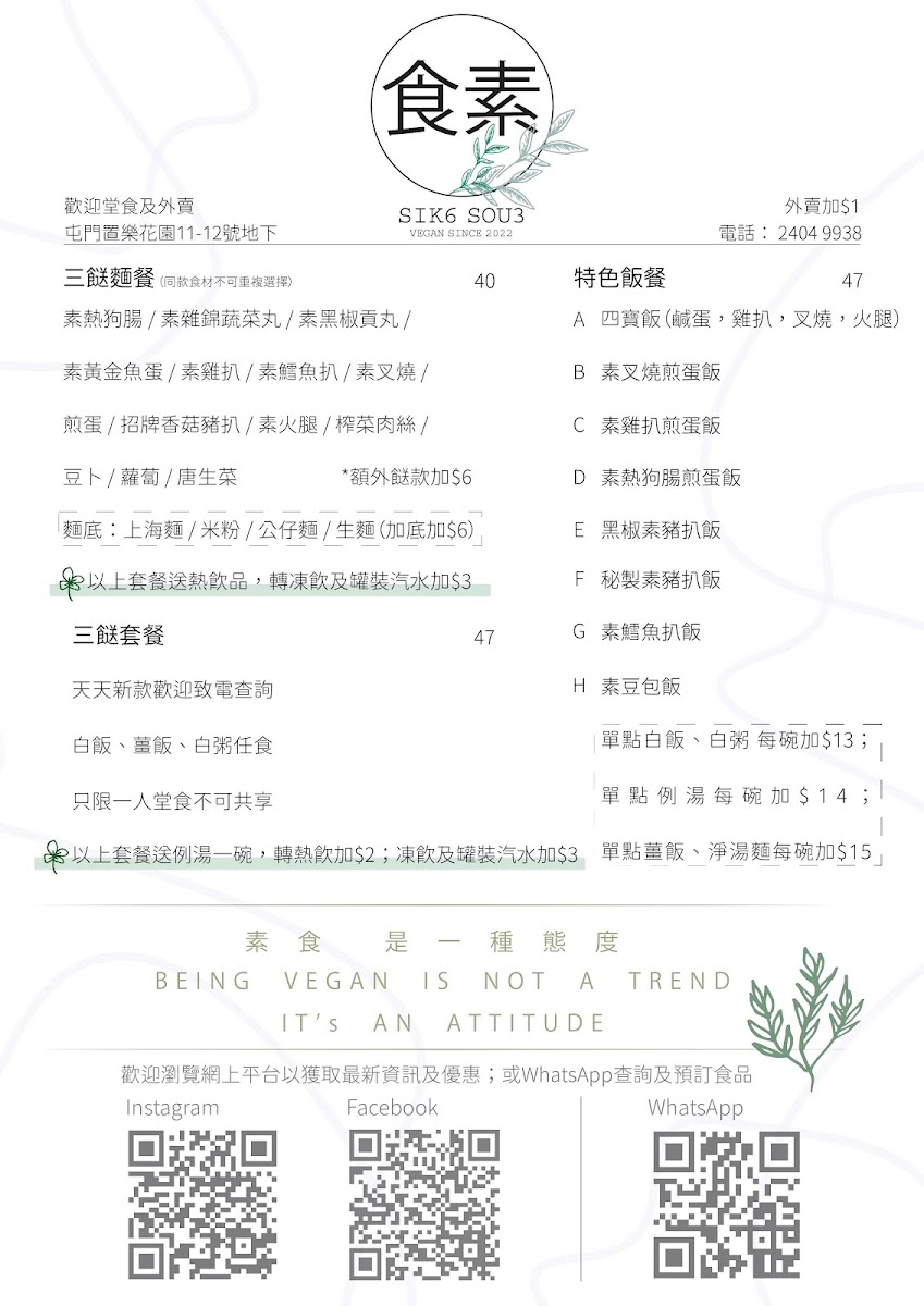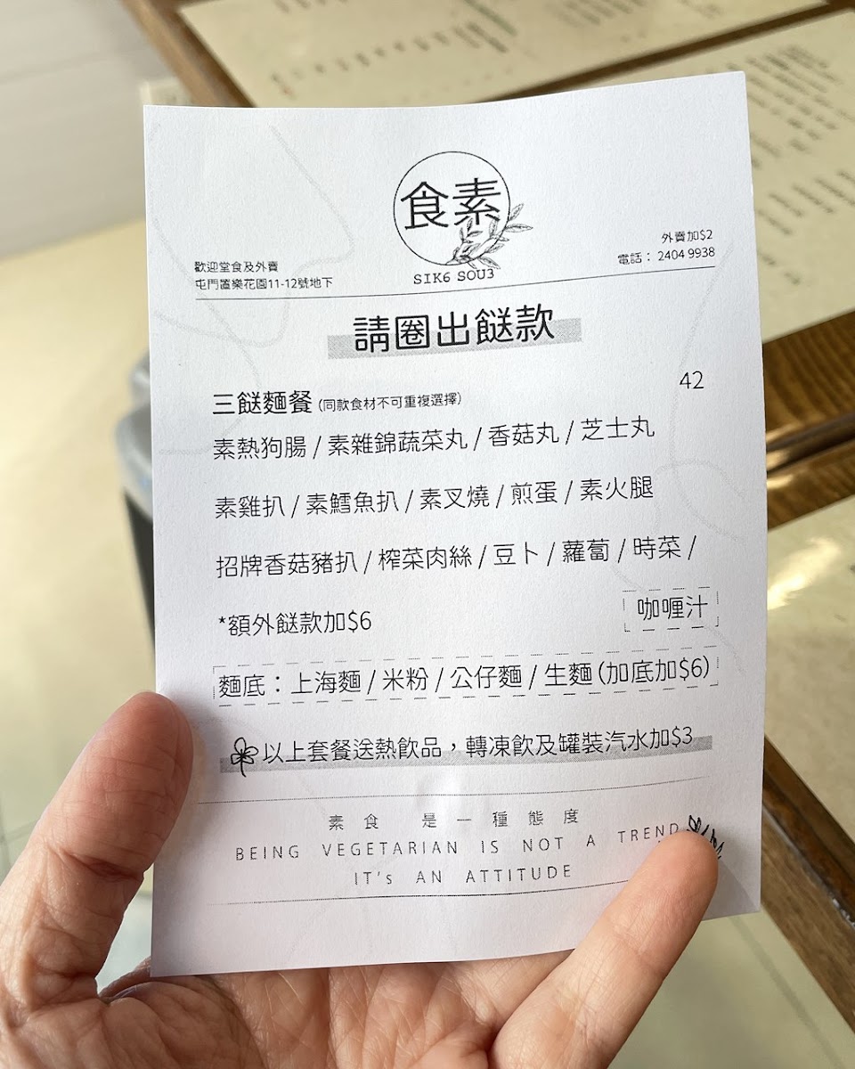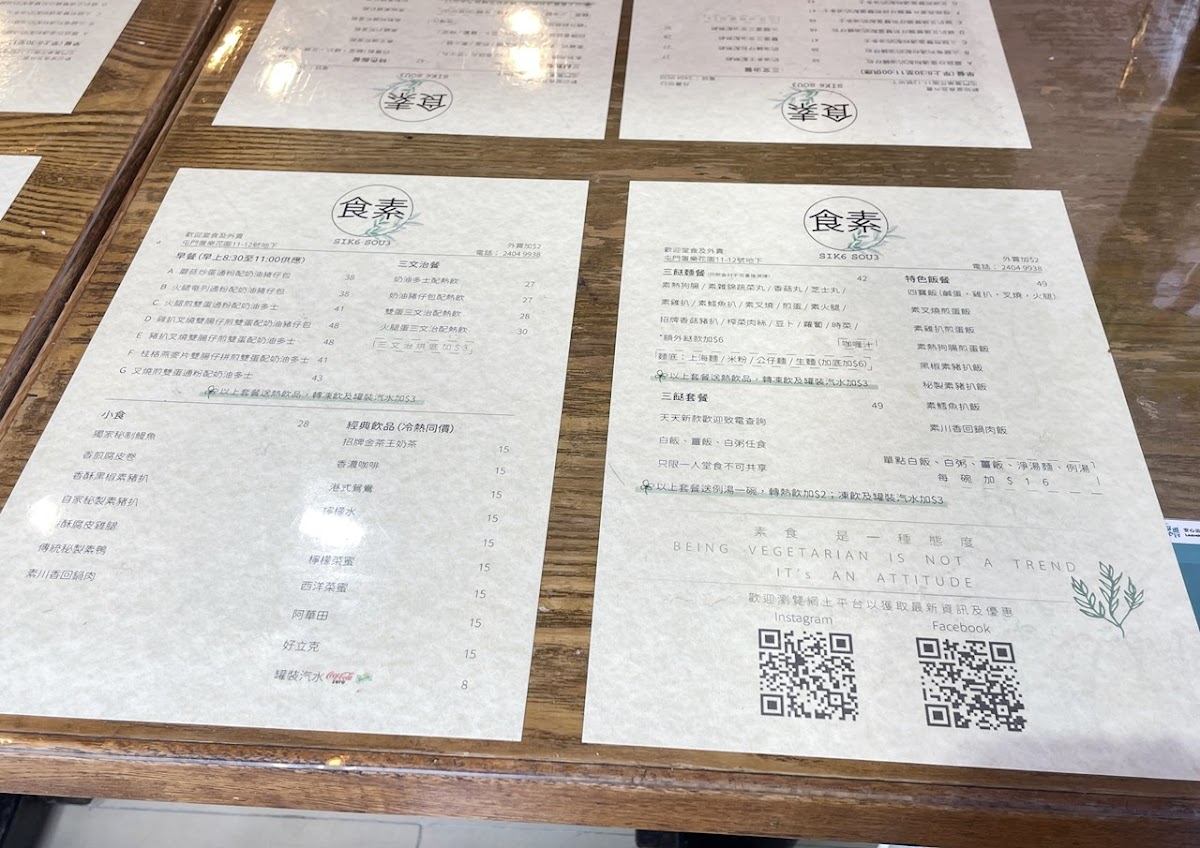 食素 SIK6 SOU3 is a humble vegetarian gem nestled in Tuen Mun, offering comforting, flavorful dishes that reflect sincere homemade care. Their daily-changing 三餸飯 (three-dish rice sets) and customizable 車仔麵 showcase a delightful range of plant-based flavors, with highlights like the Twice Cooked Vegetarian Pork in Sichuan style and Deep-Fried Vegetarian Pork Chop with Black Pepper earning high praise. Each meal is served with a nourishing, MSG-free soup, praised by regulars for its clean and wholesome taste.